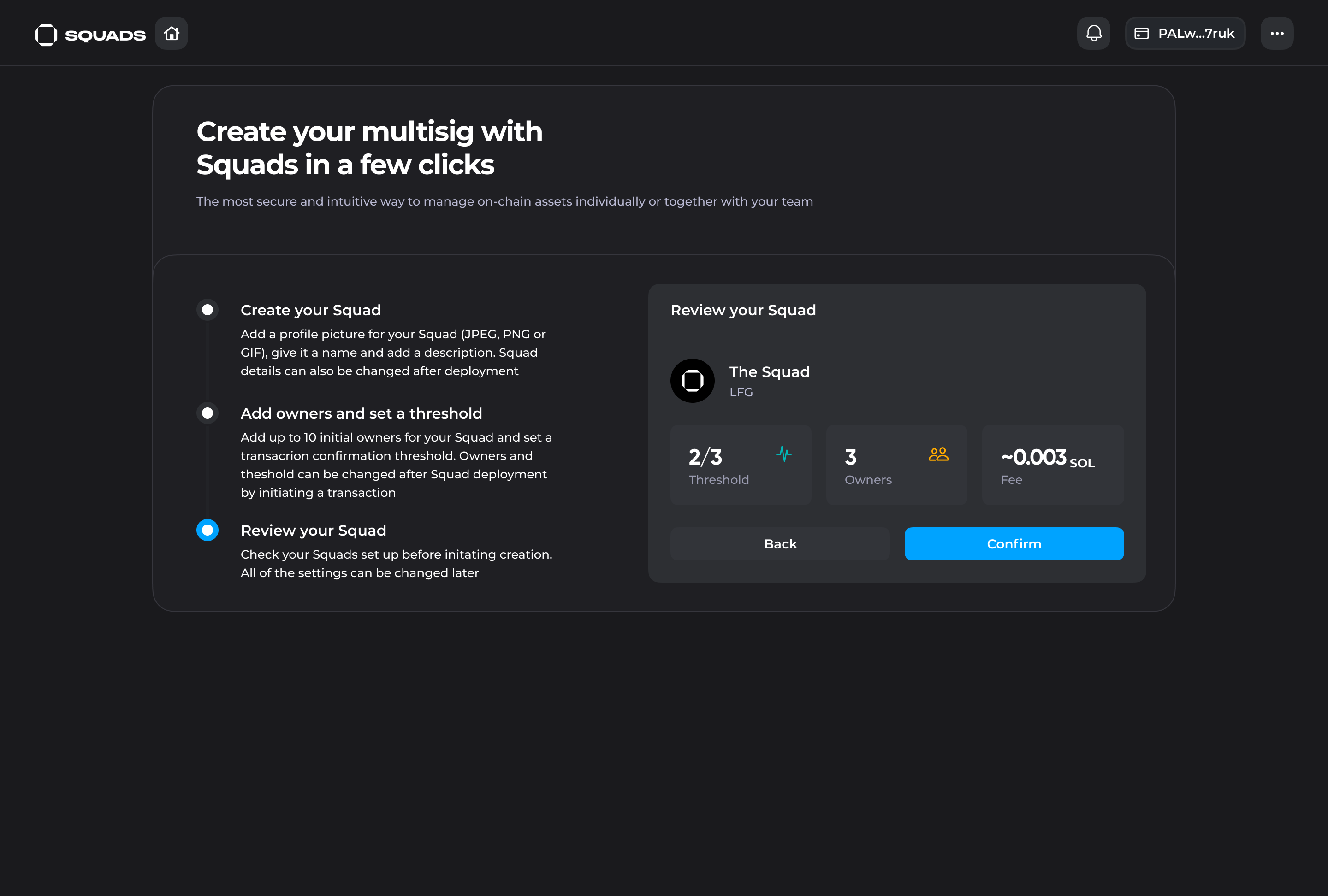 <figure><img src="https://content.gitbook.com/content/gDRN91t7KCCGF3GOssvZ/blobs/5jyzx4YglzFTEF3xkbIy/Create%20a%20Squad%204.png" alt=""><figcaption><p>Squad owners and confirmation threshold set-up</p></figcaption></figure>