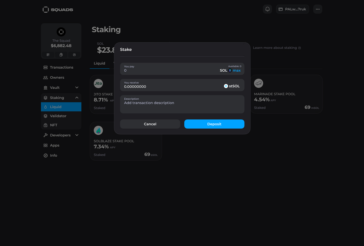 &#x20;4\. Your SOL will start the activating period upon the transaction execution (more on the transactions [here](https://docs.squads.so/main/squads-legacy/navigating-your-squad/transactions)) and will appear in the vault as the stSOL. Once the new epoch starts, you will start earning rewards.