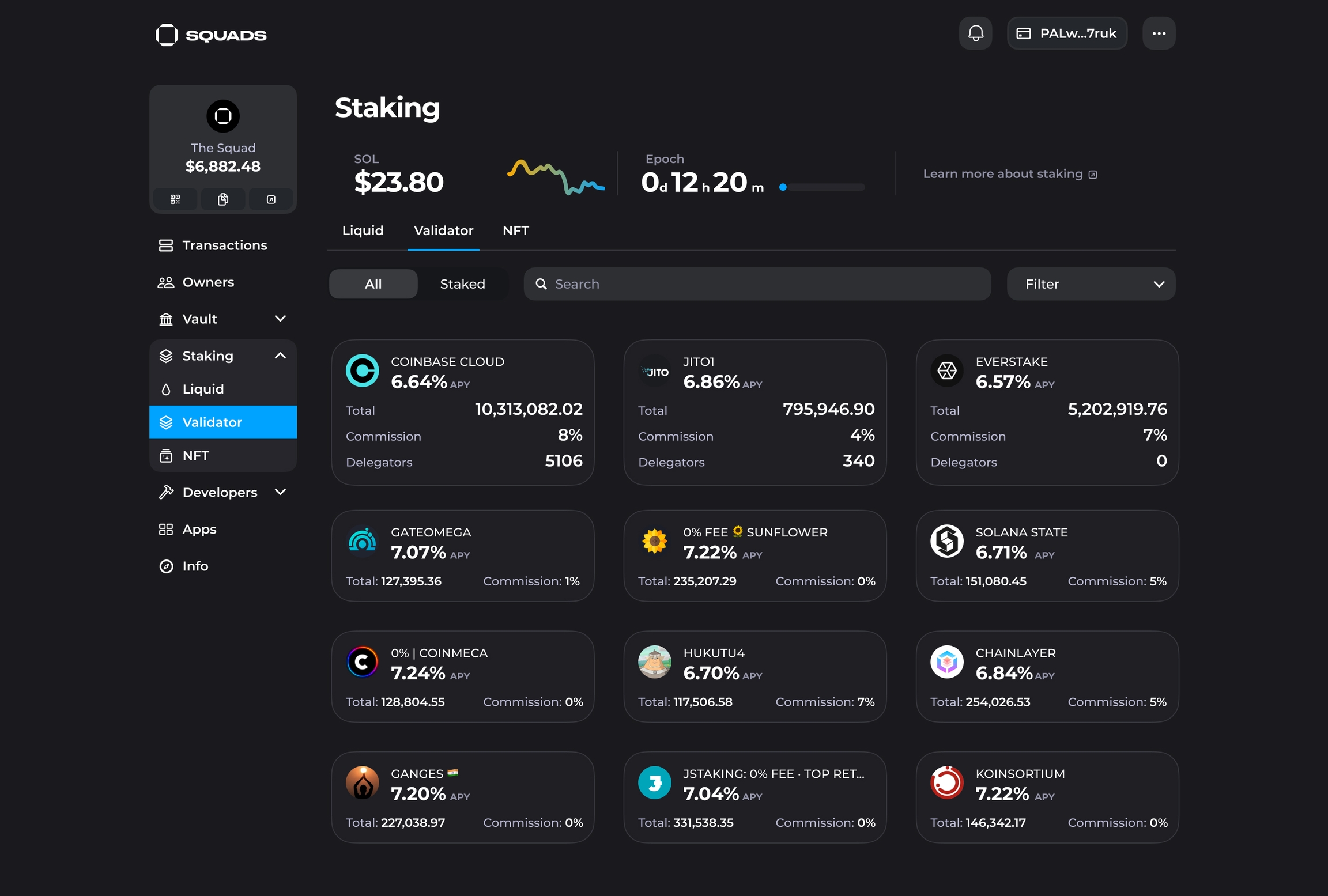 Users can stake their SOL holdings with the Solana Network validators directly from their Squad.