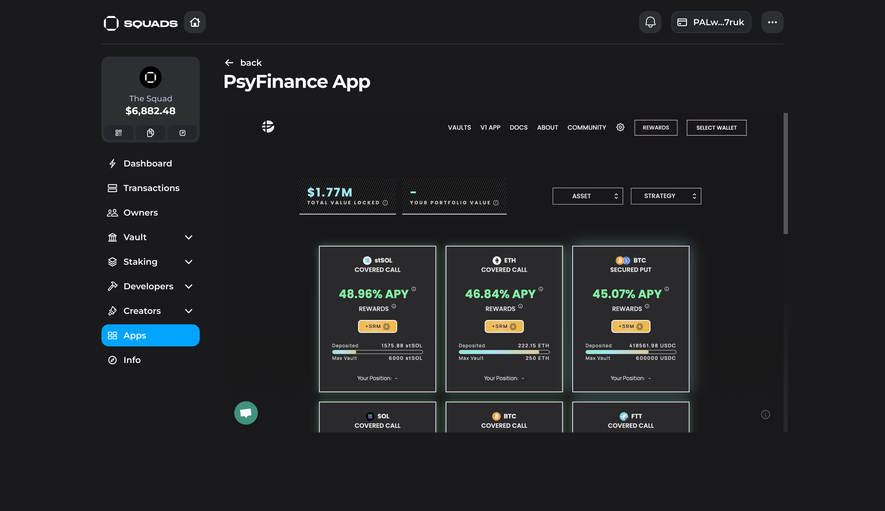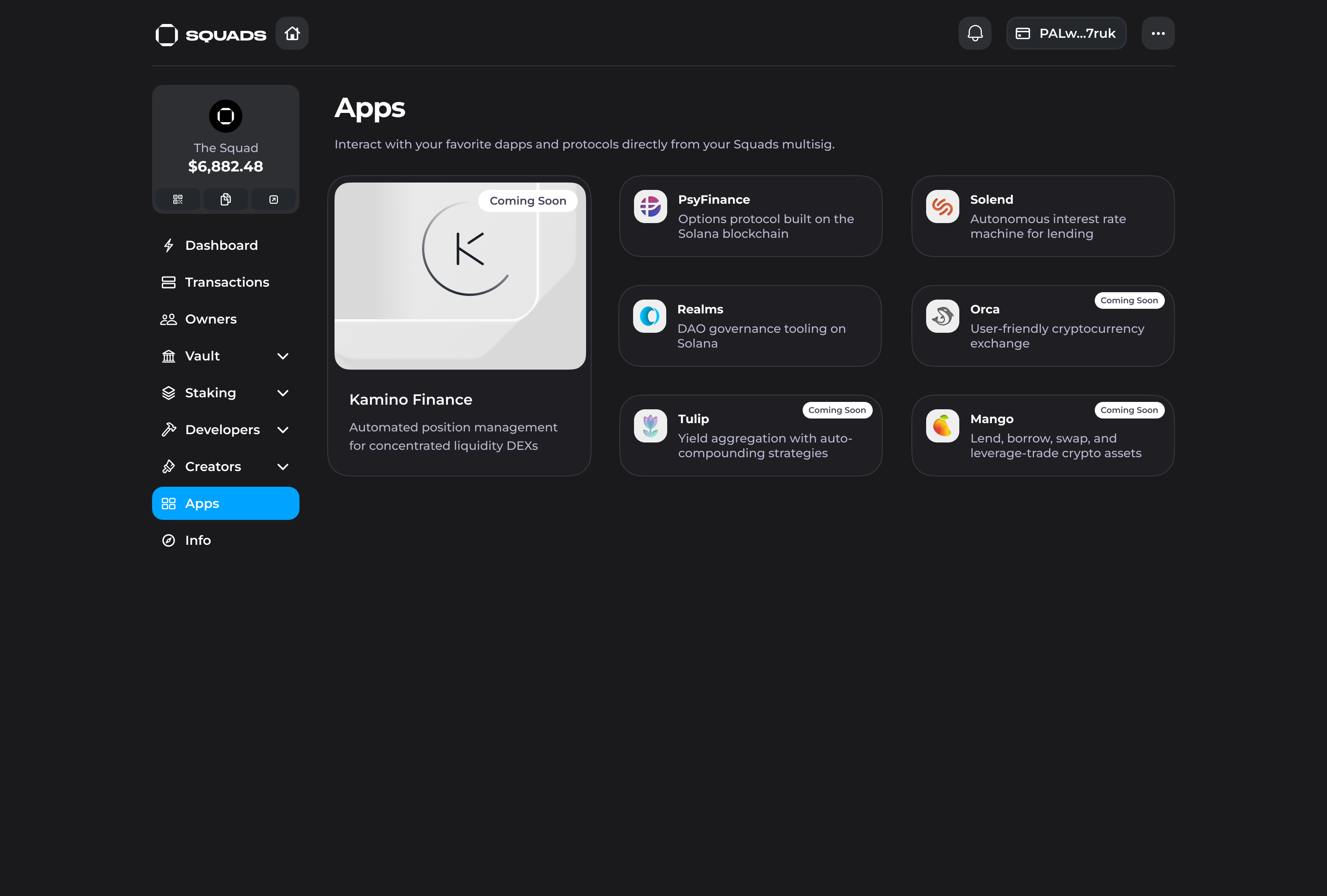 Apps section allows users to interact with the featured protocols and dapps directly from their Squad.