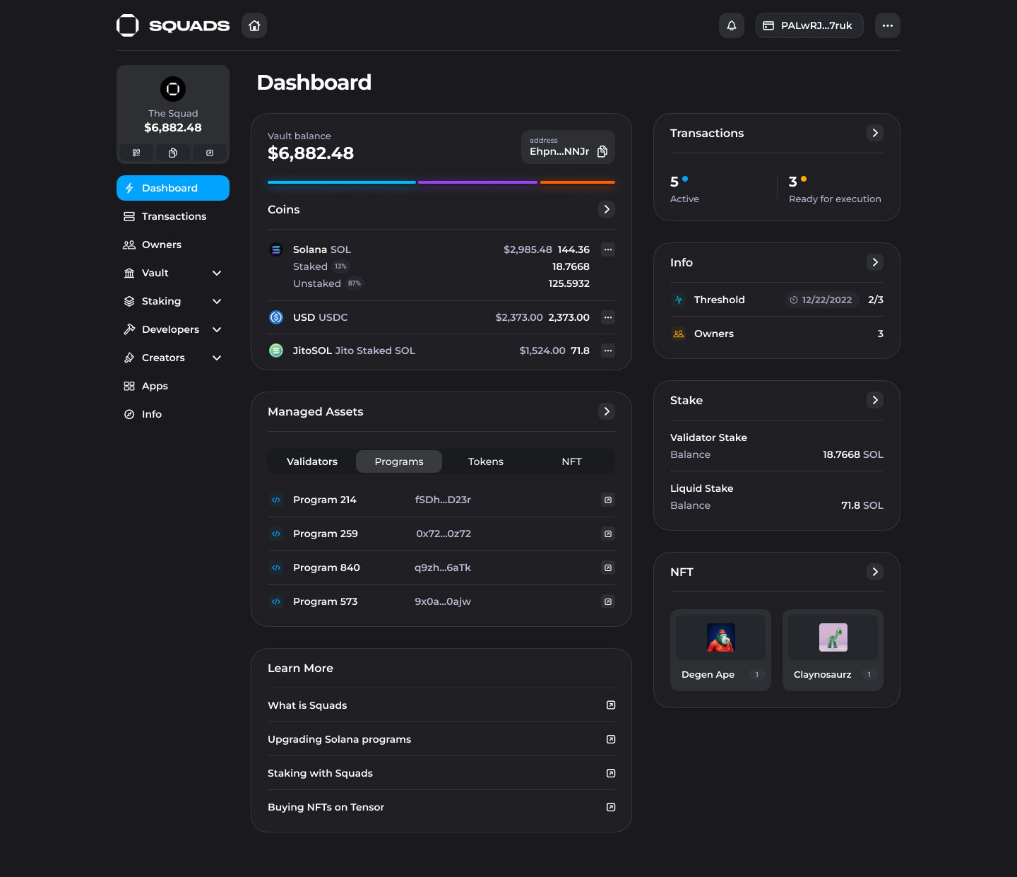 - Vault - here you can see the total balance of your Squad and all SPL tokens currently inside your vault. (Learn more Vault)