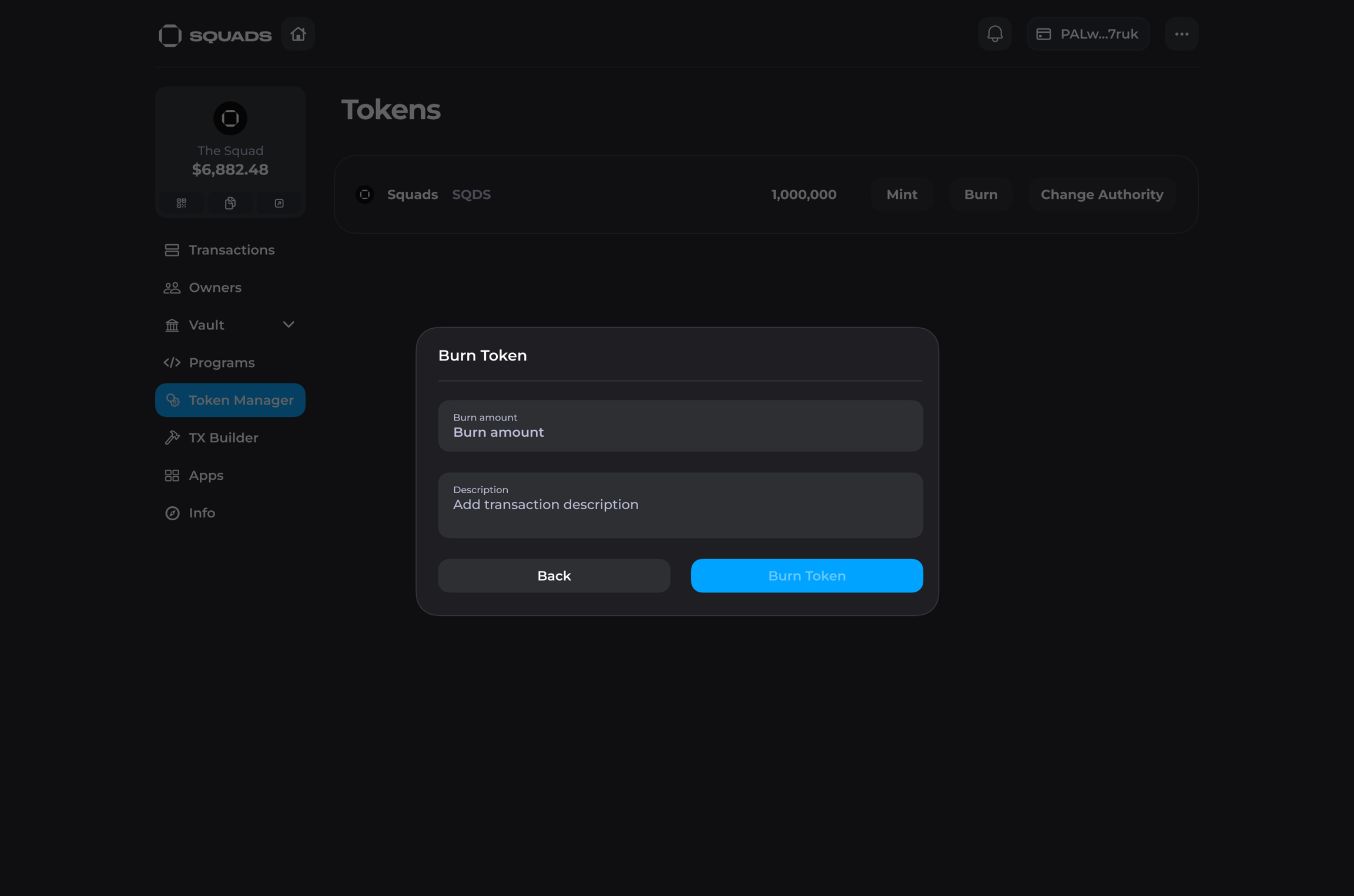 In the pop-up fill in the burn amount and insert the transaction description (optional). Click on the "Burn token" button to launch a transaction.