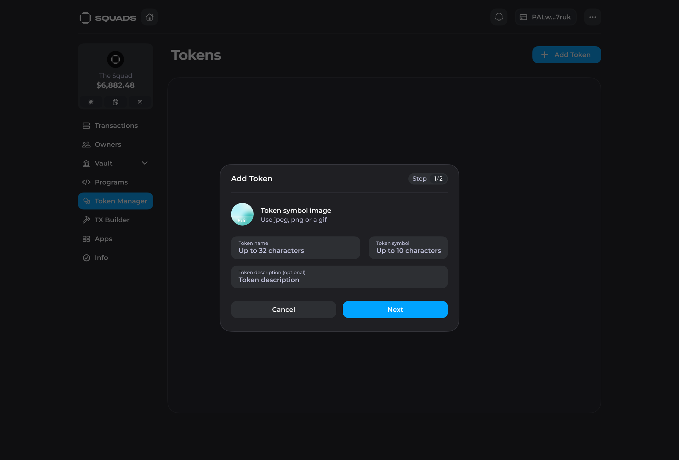 Please note that to create a new token, you will need a minimum of 0.003 SOL in your Squad vault to cover the cost of creating ATA for this token.