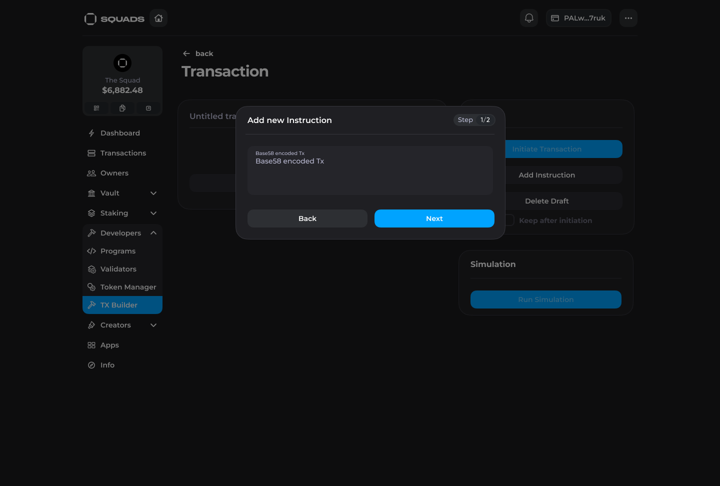 1. Click on the draft, click “Add instruction”, select the "Import base58 encoded tx" option.