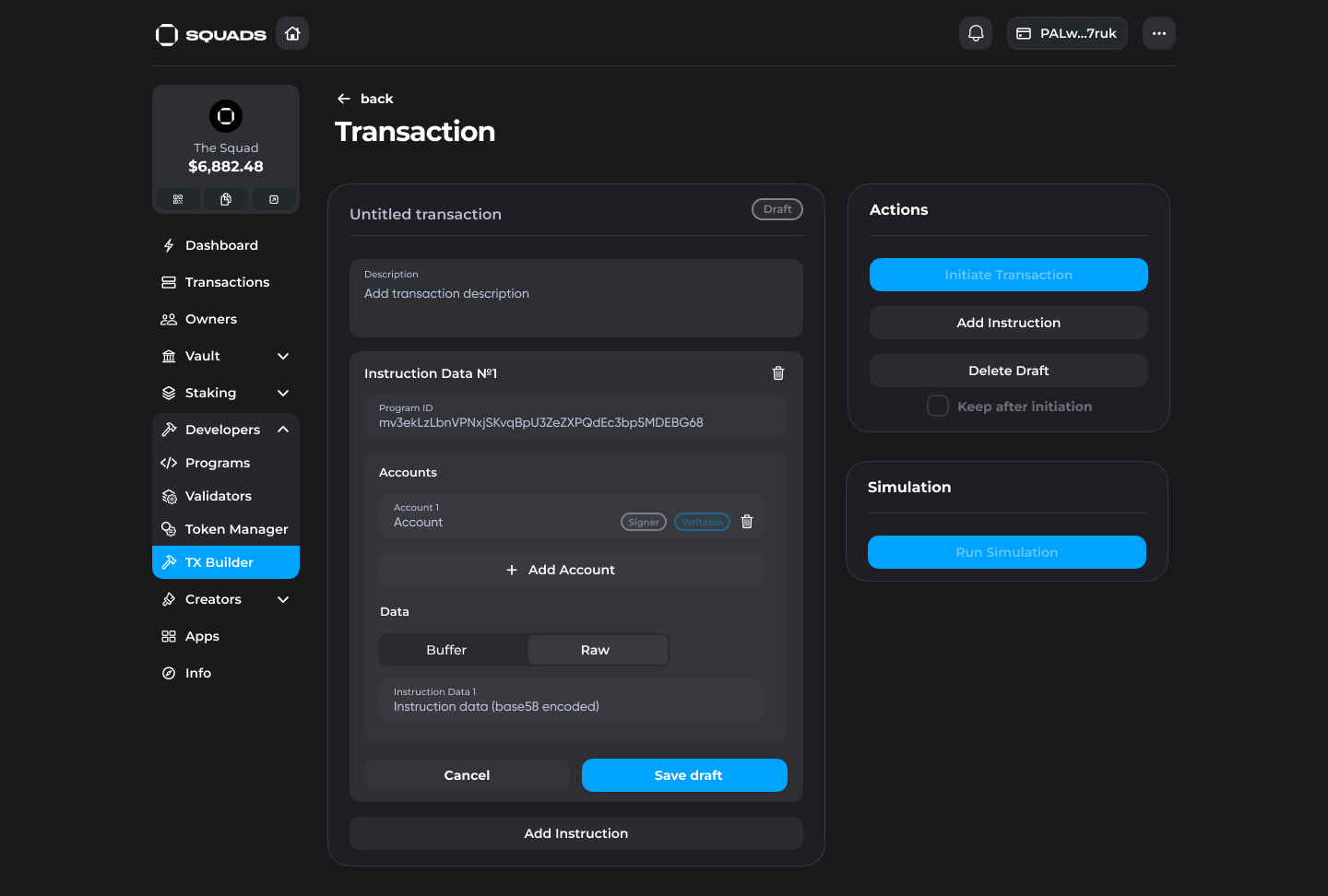 3. Insert the account info and then populate the desired data options (Buffer or Raw). Then click "Save draft". You can add another instruction inside the draft to run two custom instructions in one transaction.