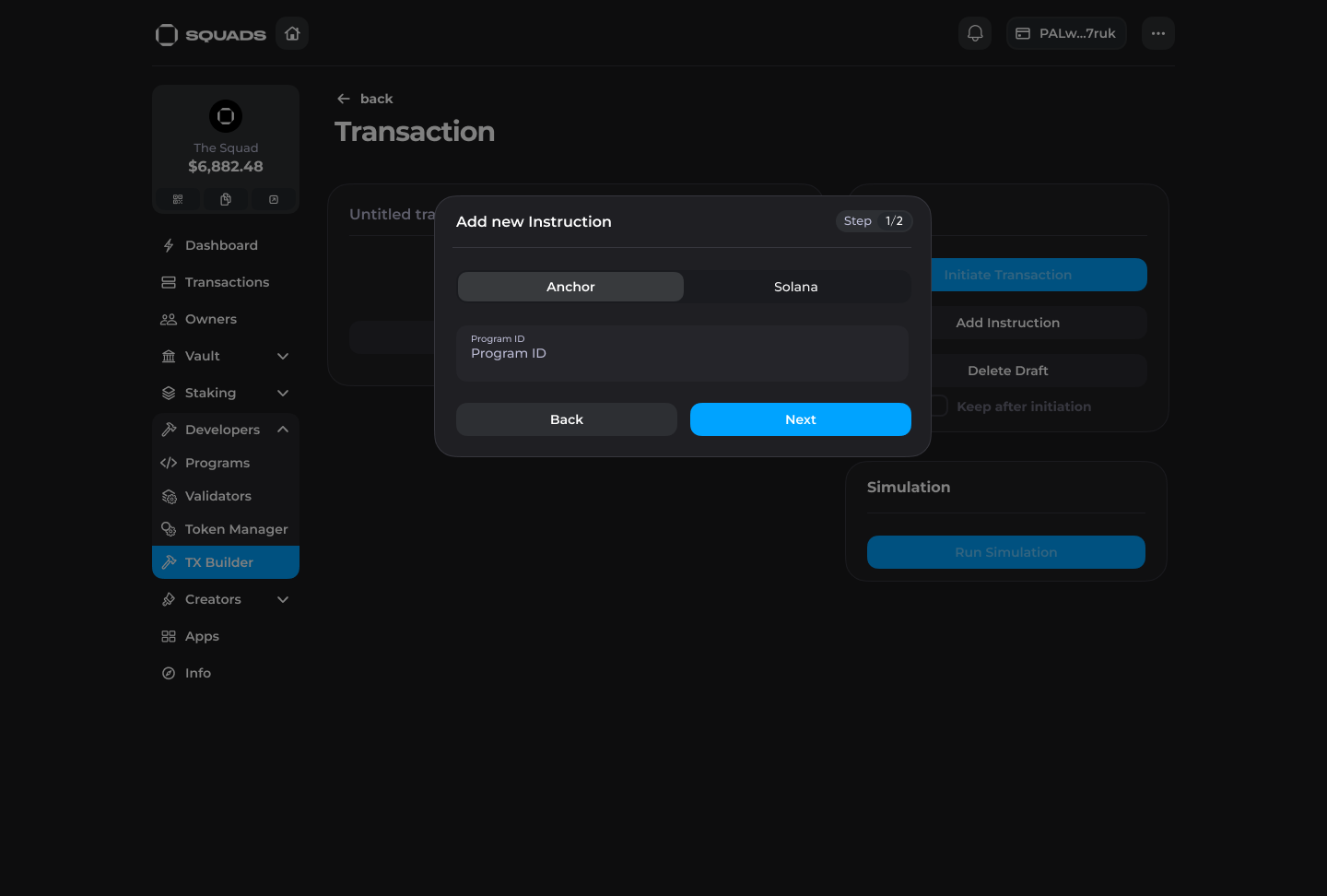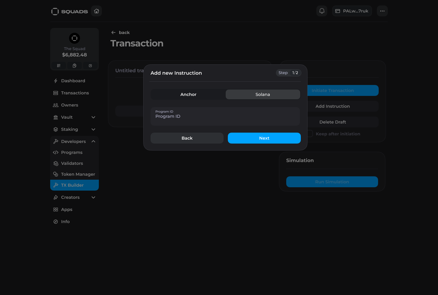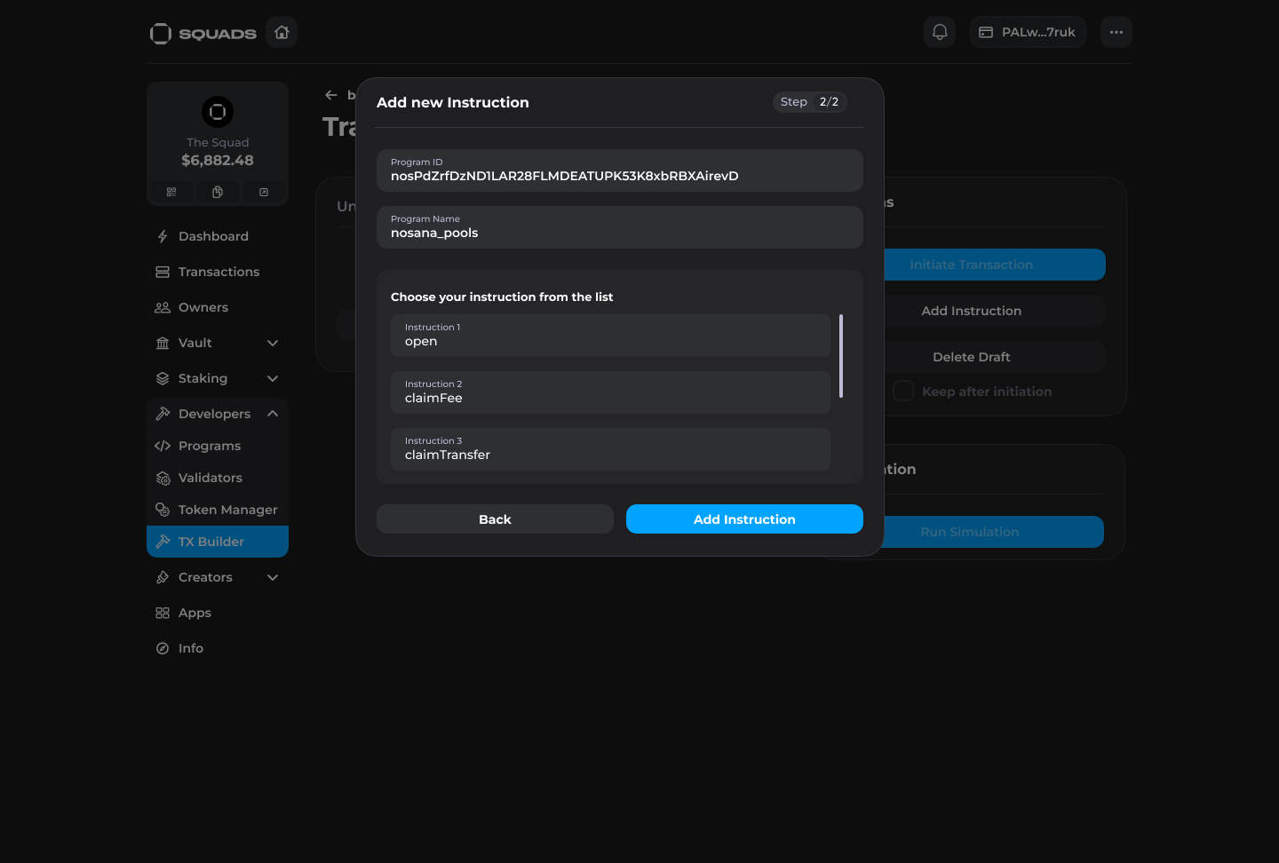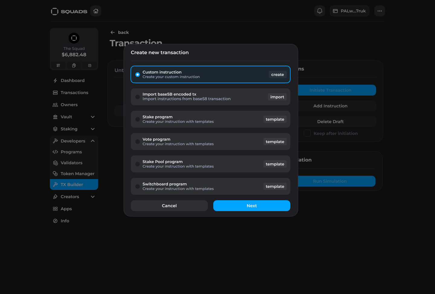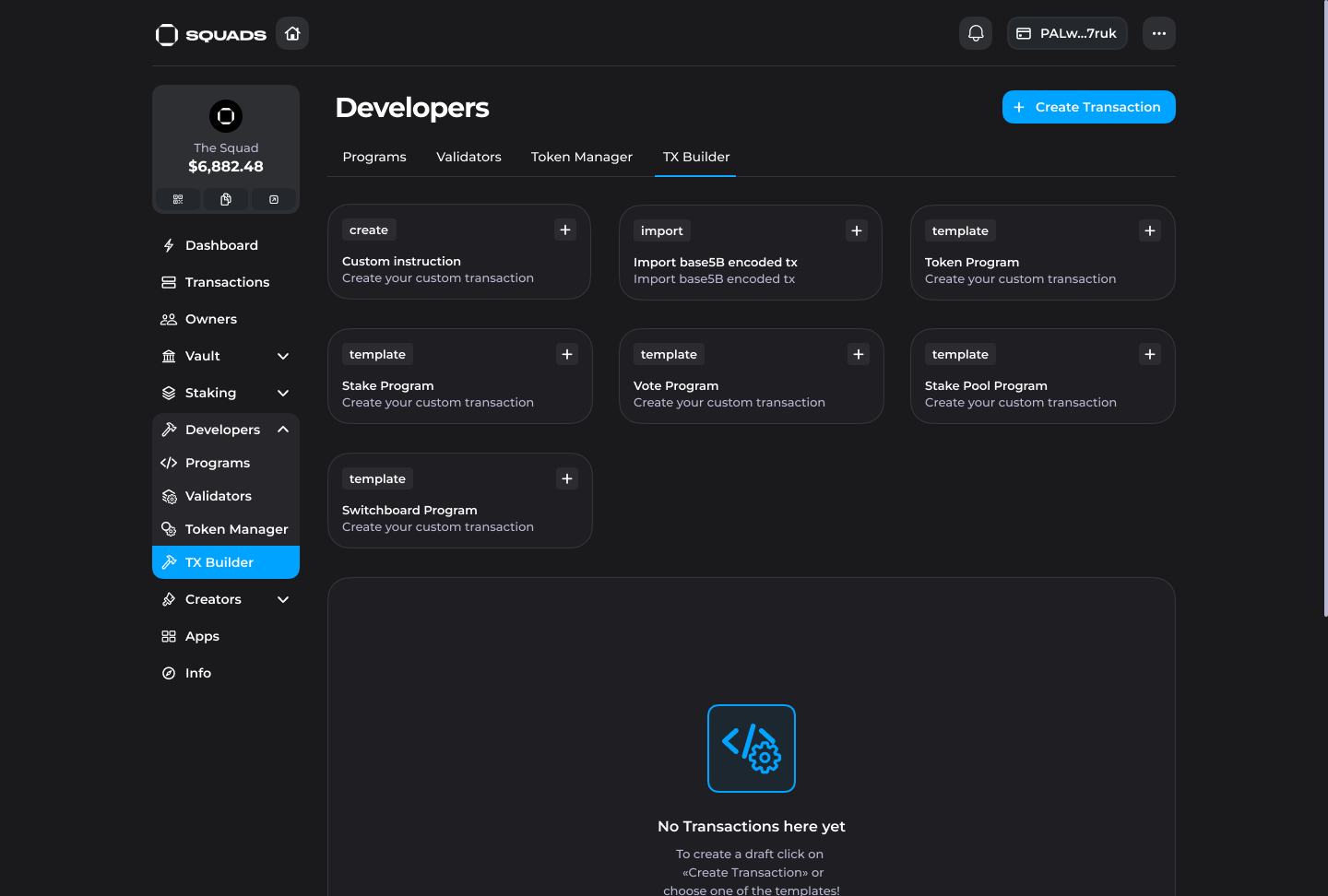 In Squad V3 users can create custom transactions and populate them with arbitrary instructions through the Transaction Builder to interact with any programs on Solana directly from a Squad.