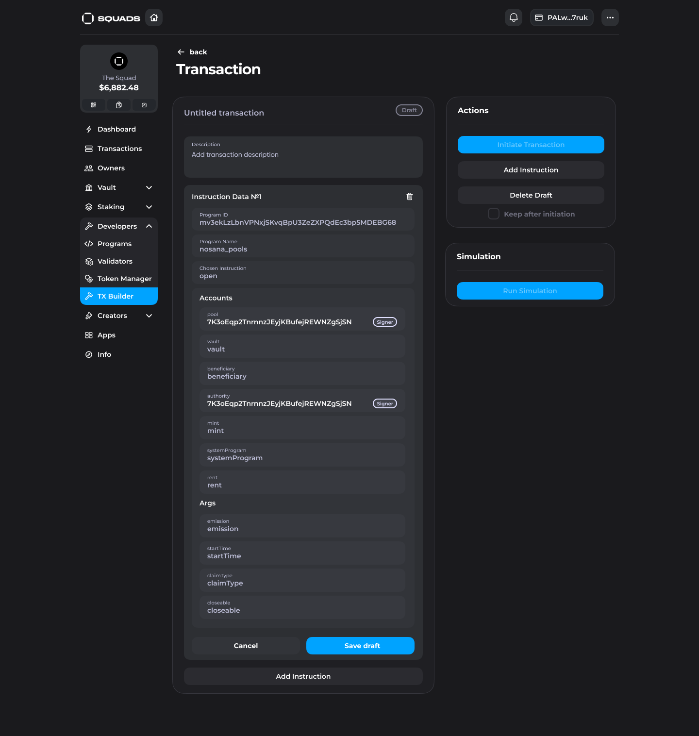 4\. Populate the Accounts with the required data and click "Save draft". You can add another instruction inside the draft to run two custom instructions in one transaction. You can also add a name and description to the transaction.