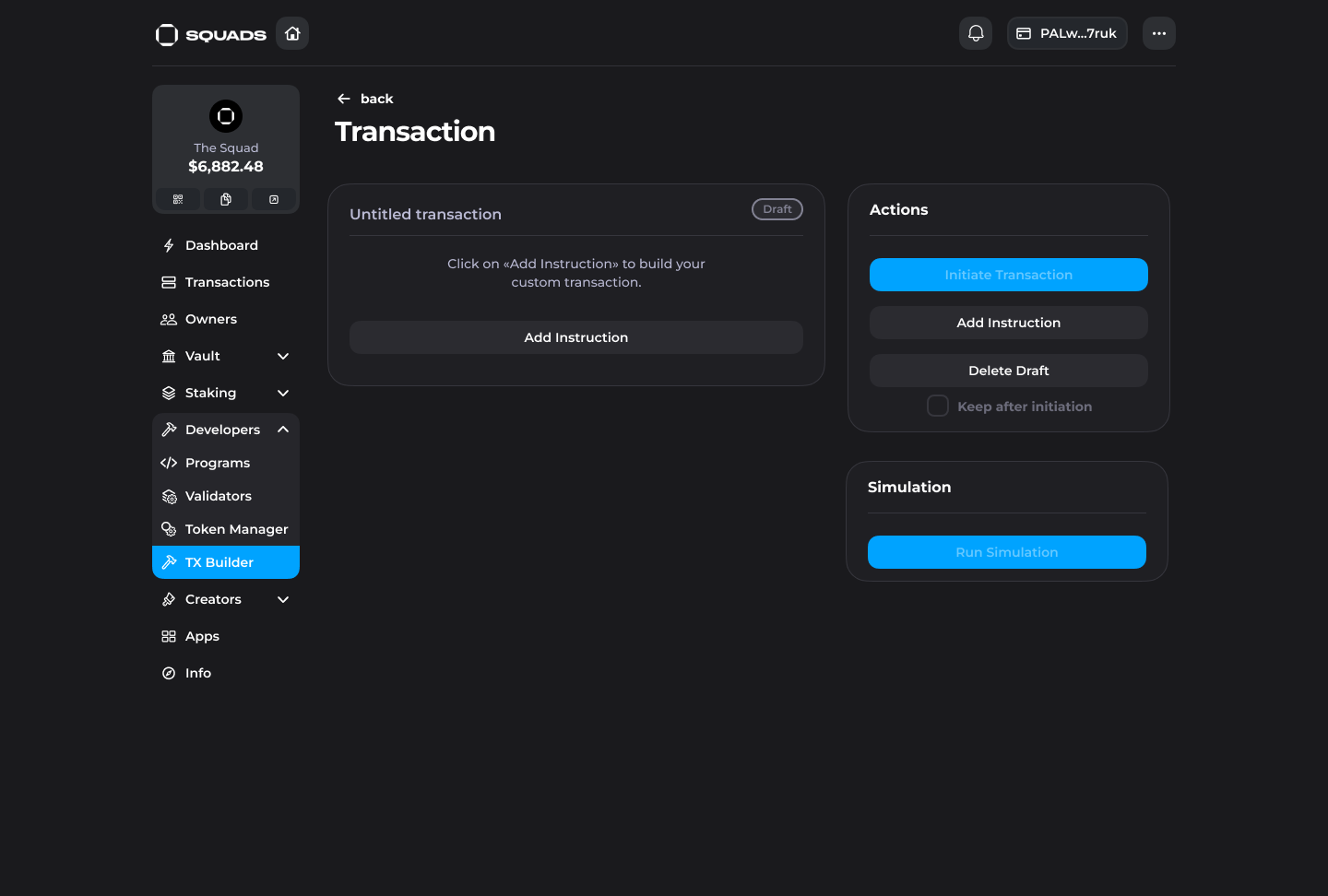 &#x20;  2\. After you click on "+Create transaction", you will be directed to the transaction screen. Here you can click on "Add instruction" to start crafting it or delete the draft if you don't need it anymore.