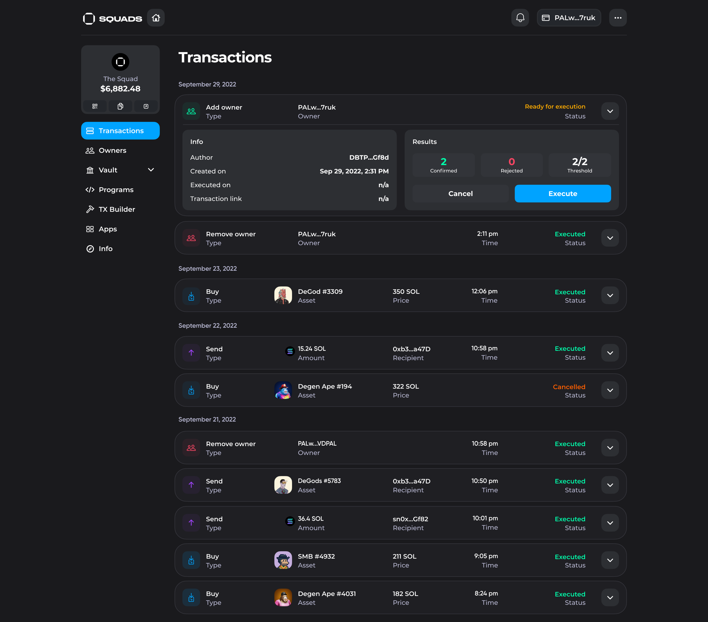 Once the transaction hits the confirmation threshold, it can be executed by any owner of a Squad.