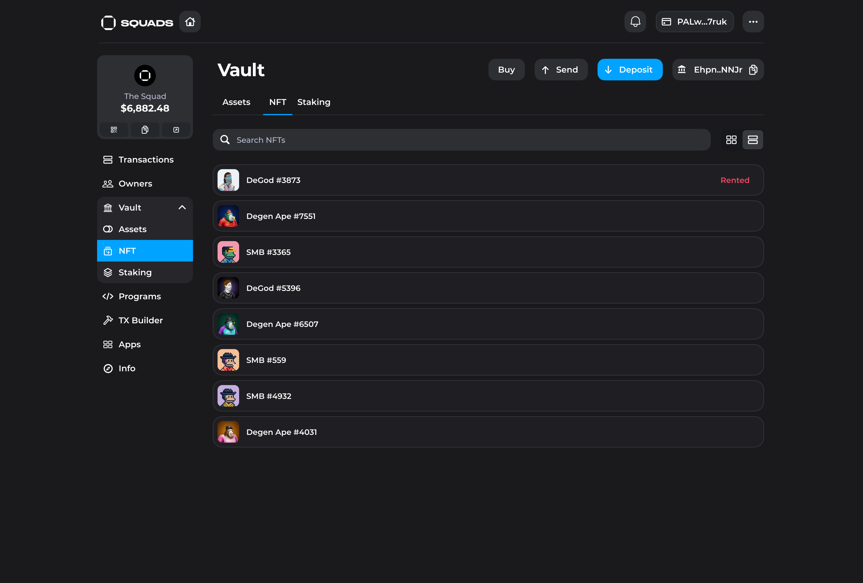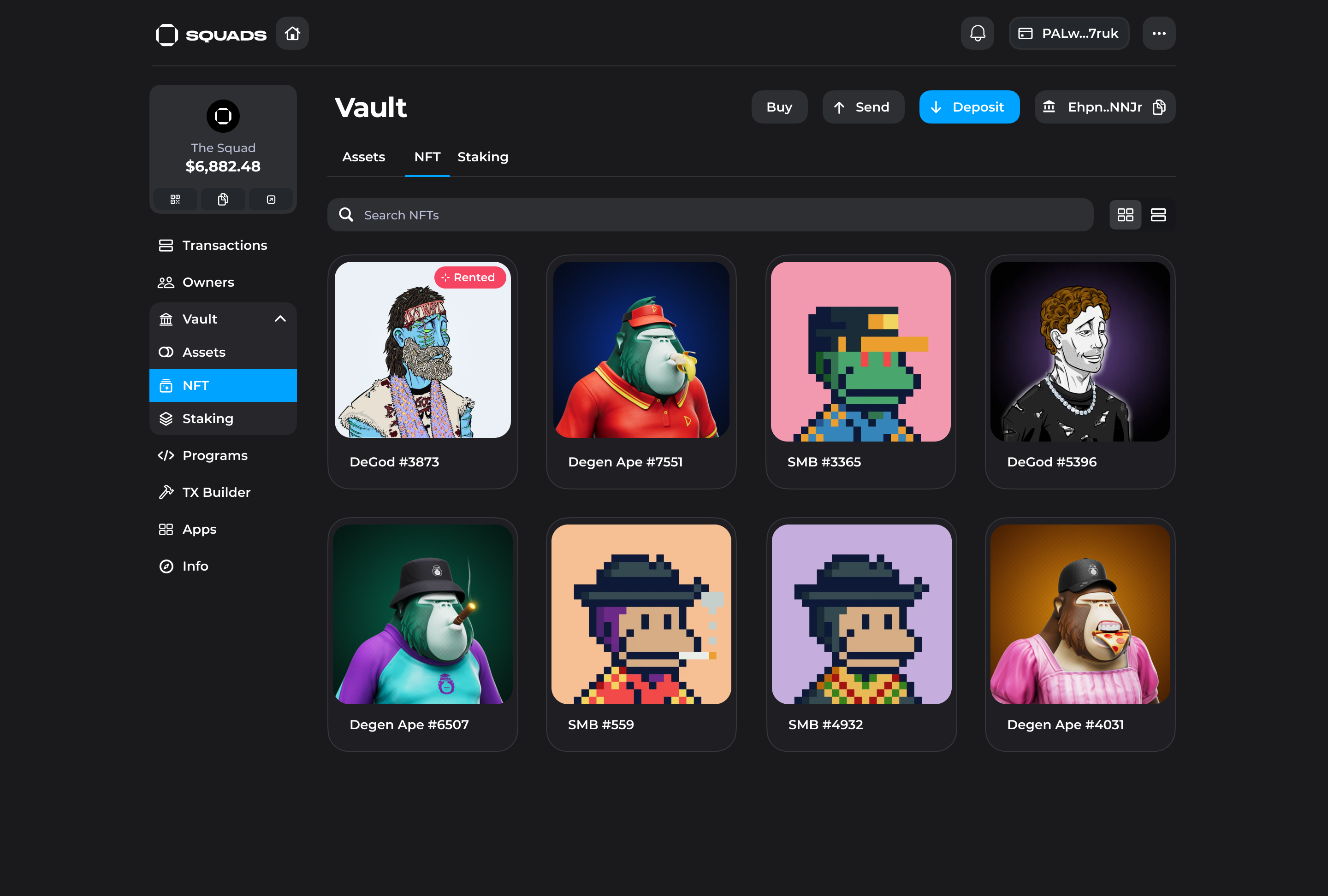 Squads support the storage of NFTs (Non-fungible tokens) in an NFT gallery. An owner can deposit up to 20 NFTs in one transaction. Withdrawals are limited to 15 NFTs per one transaction.