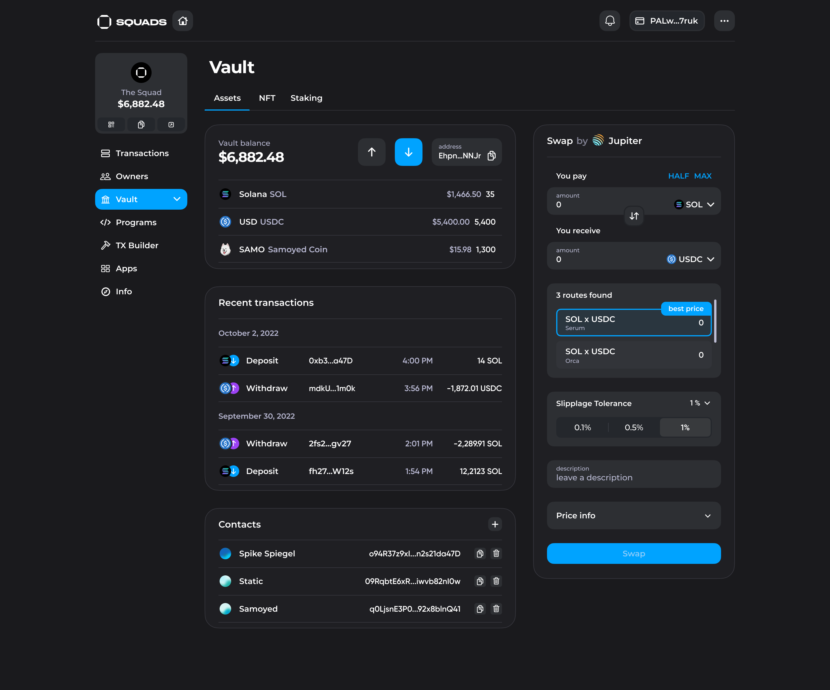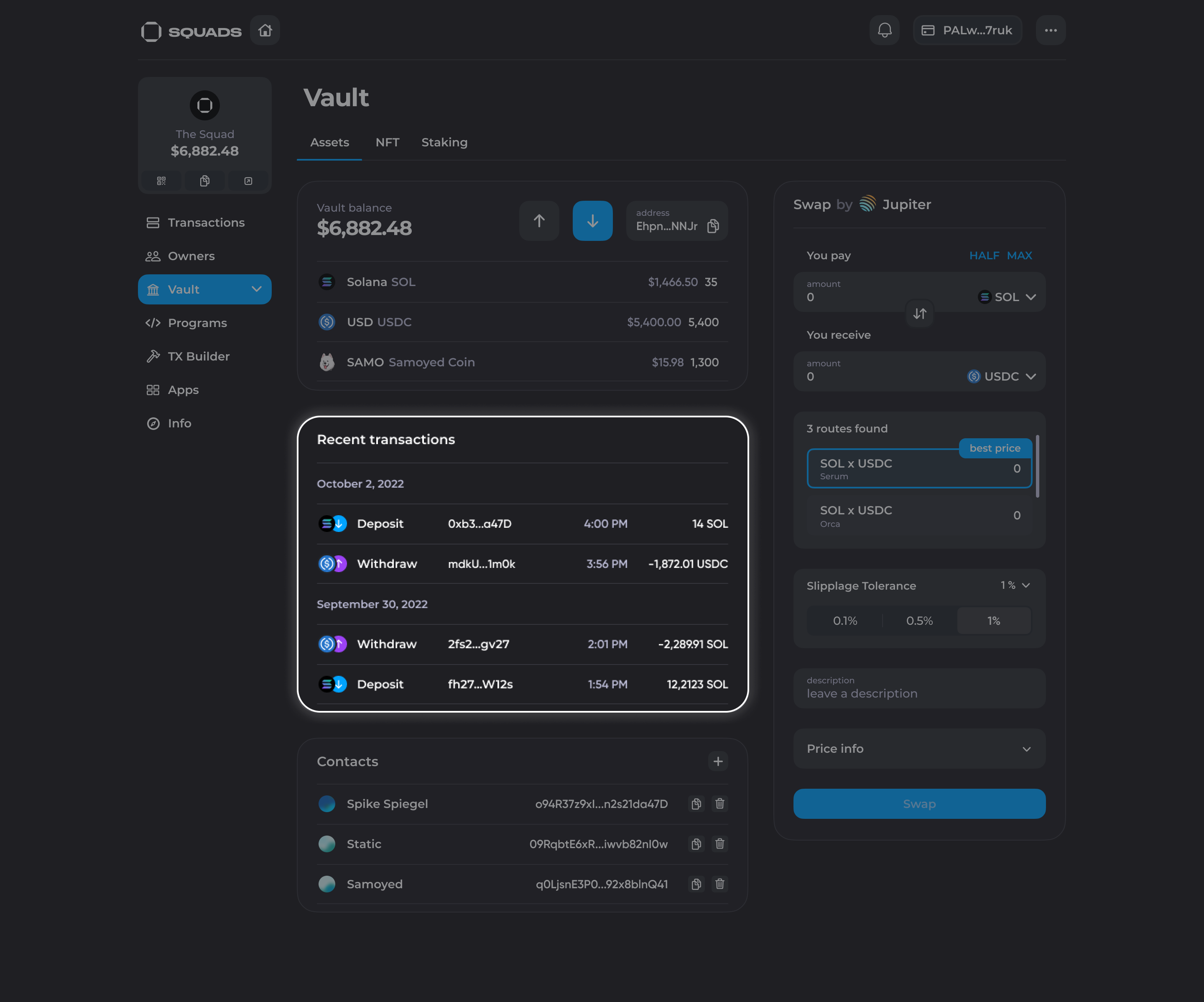 * any owner to initiate a swap of Vault assets which will trigger a transaction for the Squad to confirm;