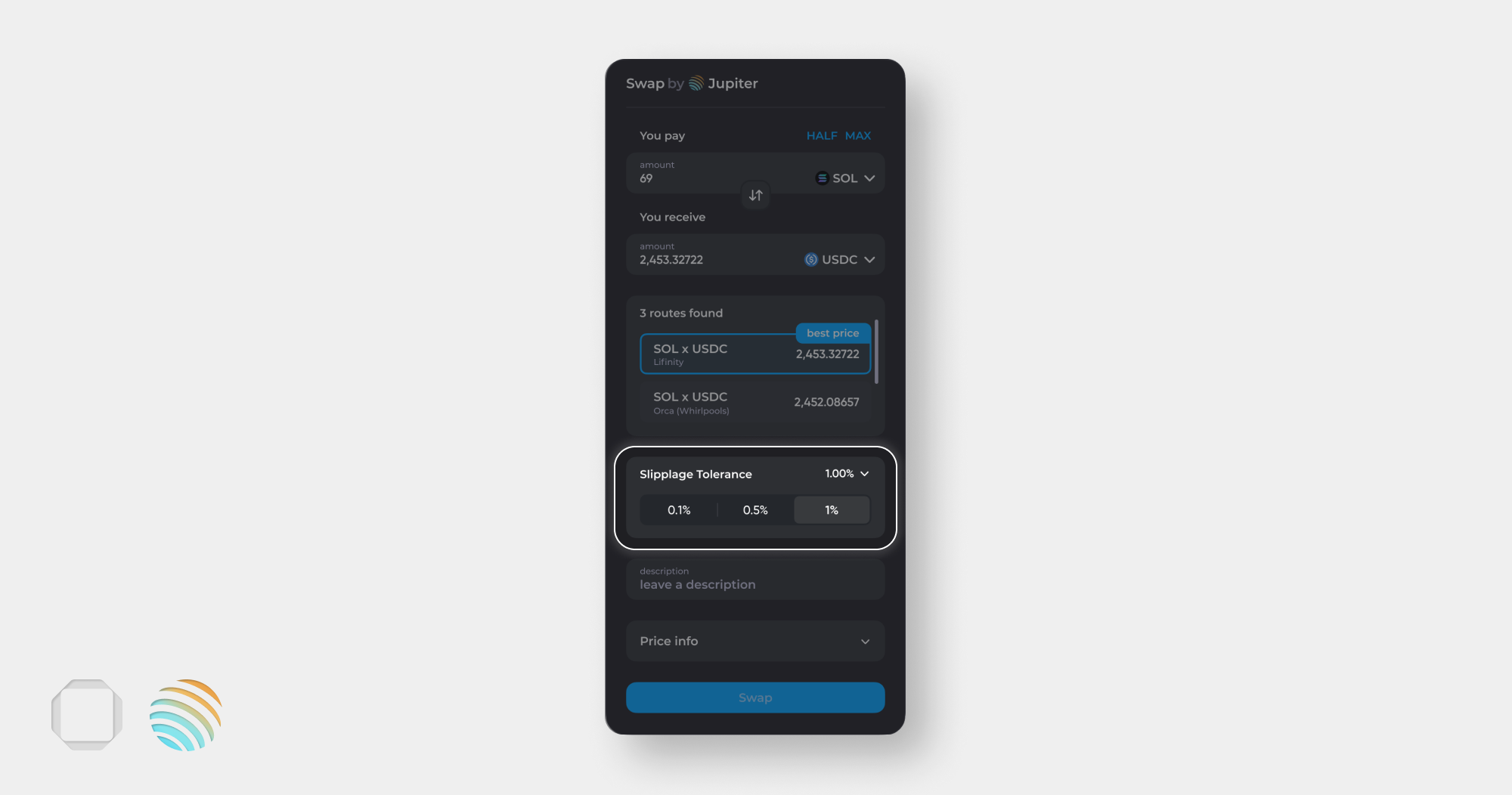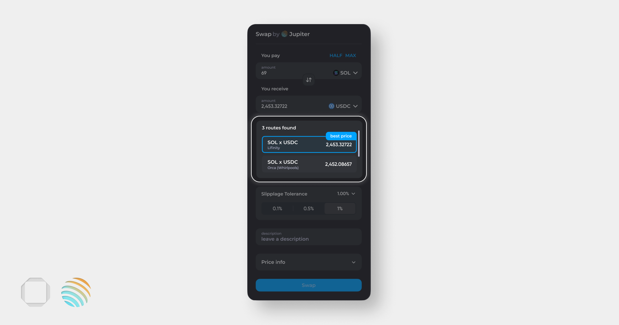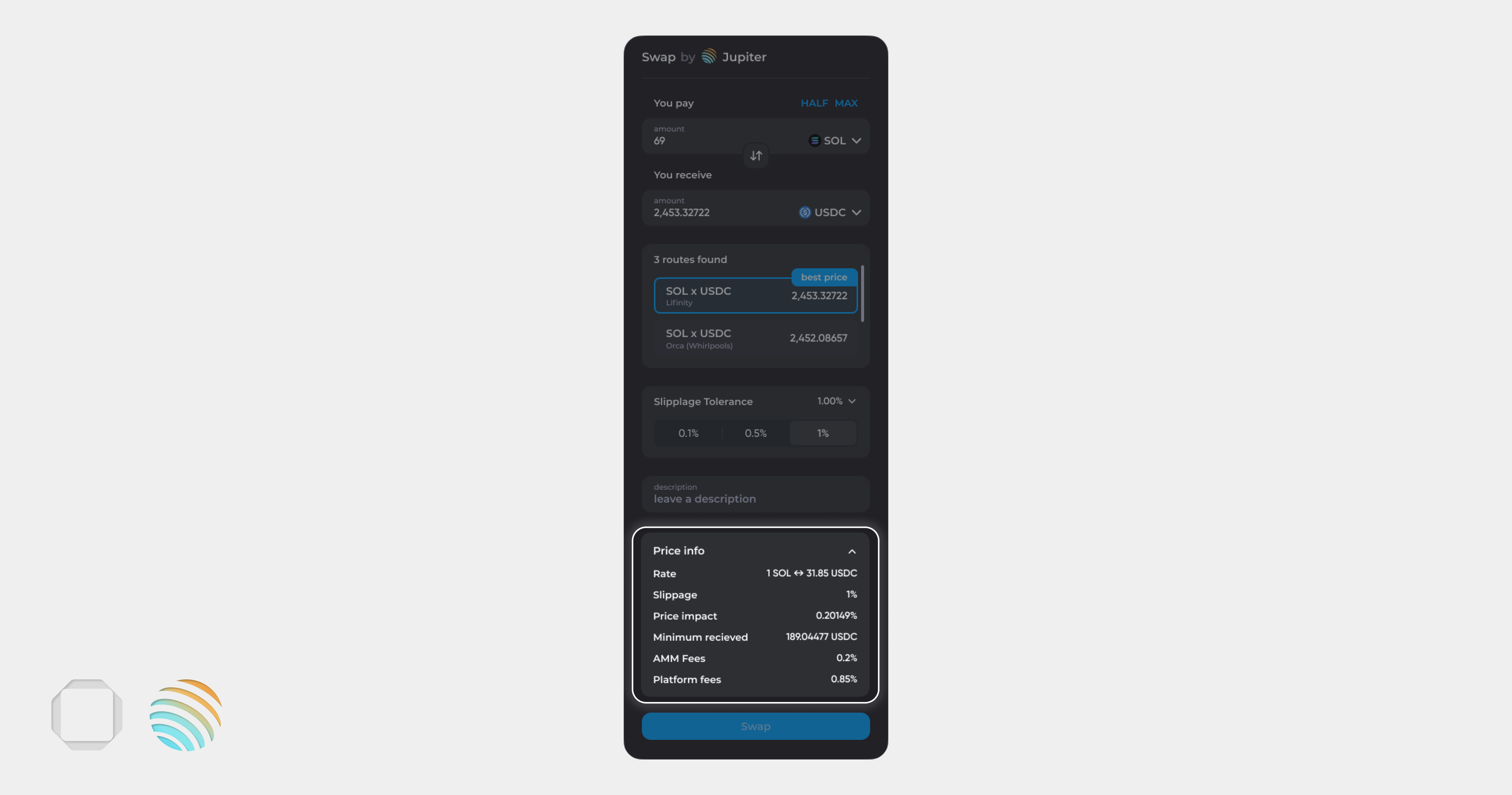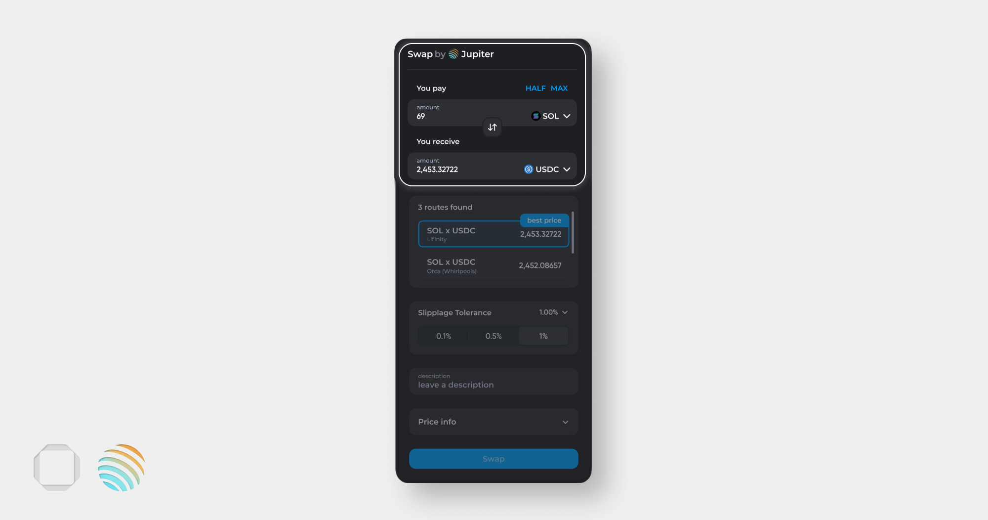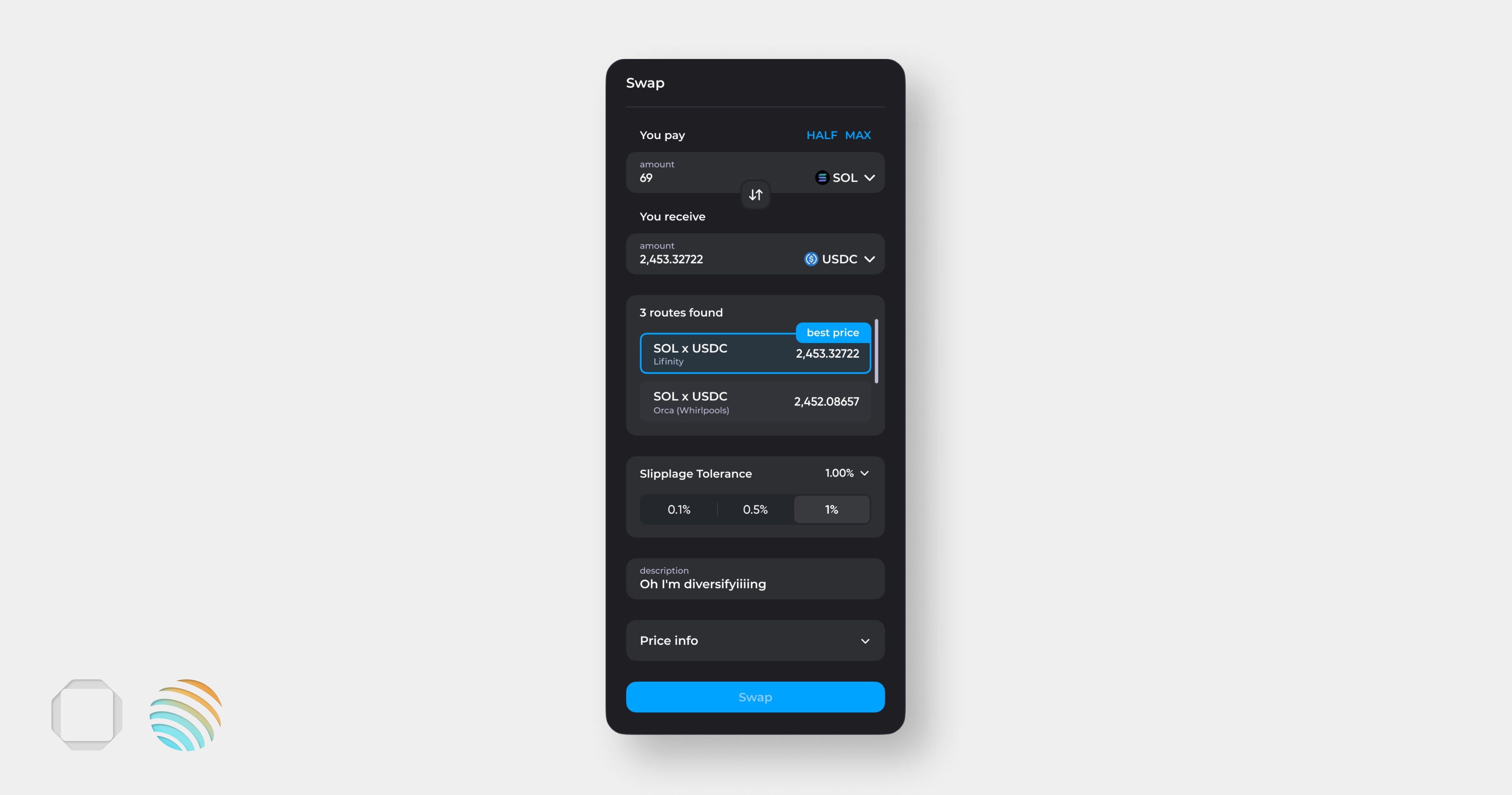 <figure><img src="https://1205508290-files.gitbook.io/~/files/v0/b/gitbook-x-prod.appspot.com/o/spaces%2FGOJv2Locm6v5eywwSeaG%2Fuploads%2FdFoTD6hBe48lu1fnPnIG%2Fswap%20193.png?alt=media&#x26;token=fc28d945-551e-46cc-84b3-37b10b9ea362" alt=""><figcaption><p>Price info</p></figcaption></figure>
