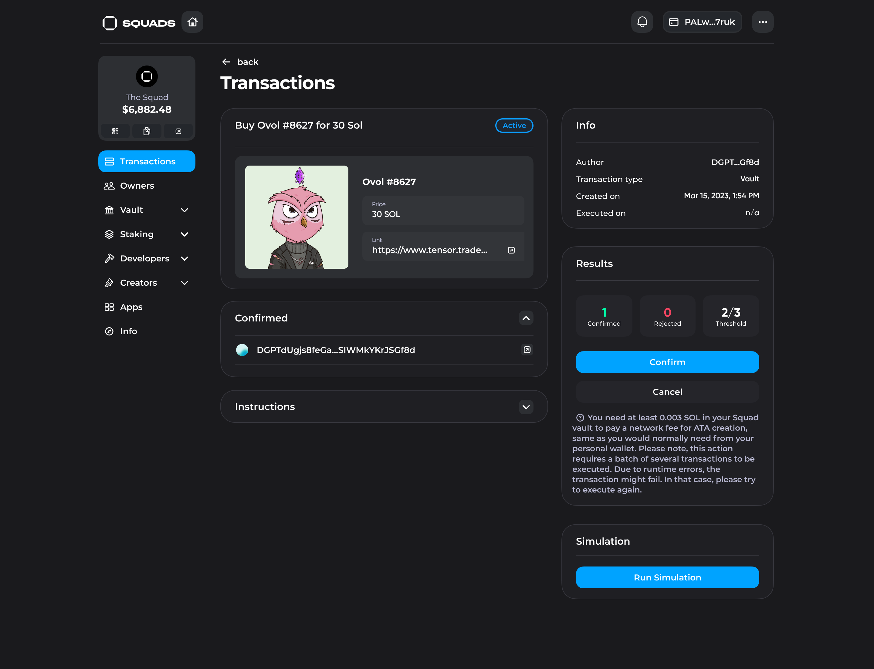 2. Click on the "Buy" button, insert the link from Tensor and launch a transaction. Make sure you have enough funds in your Squad vault to purchase the NFT.